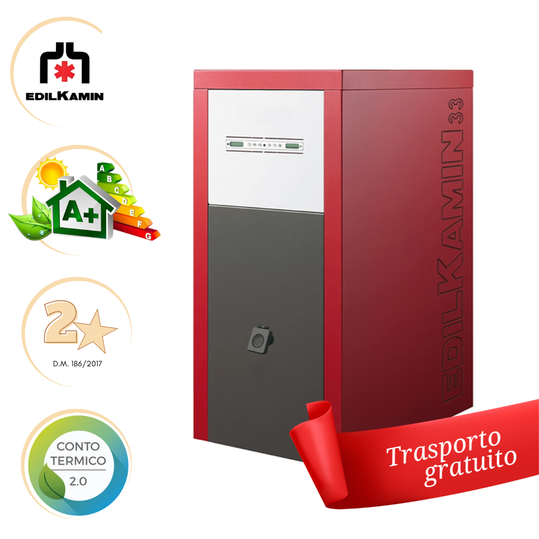 Caldaia a pellet ideale per chi dispone di un locale dedicato: con i suoi 33 kW di potenza alimenta i termosifoni e i pannelli a pavimento per riscaldare superfici molto ampie.