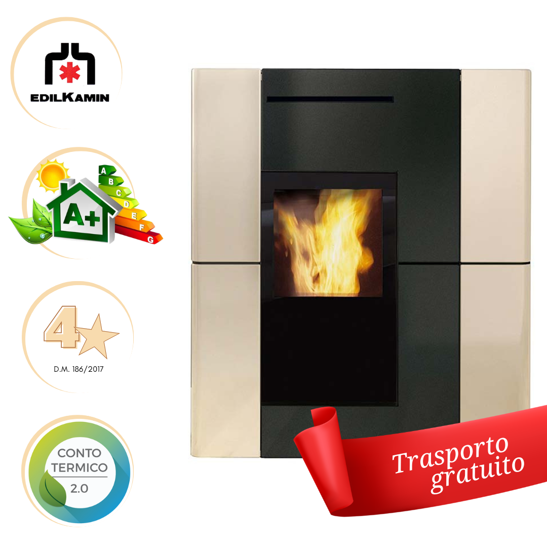 Termostufa a pellet che alimenta i termosifoni e i pannelli radianti a pavimento di tutta la casa. Si può abbinare ai pannelli solari e/o alla caldaia a gas.