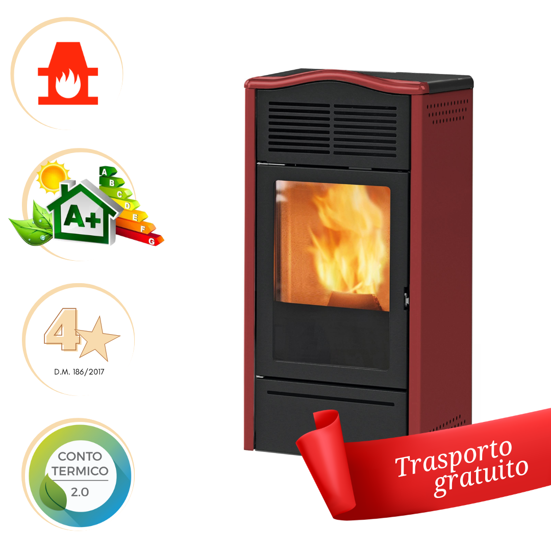 Stufa a pellet con rivestimento in acciaio in 4 colori: beige, bordeaux, bianco opaco e grigio.