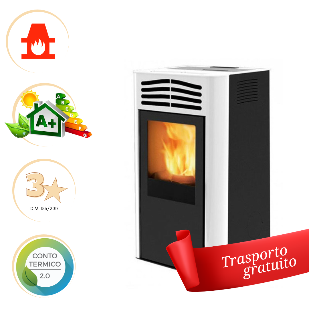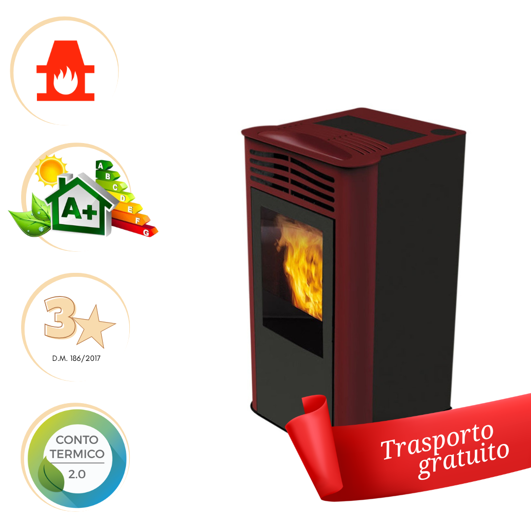 Stufa a pellet con porta in ghisa e griglia in metallo, focolare in vermiculite.